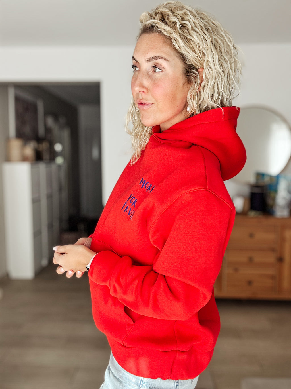 Stylischer Hoodie von Frau Kauf in leuchtendem Rot mit Frontprint „More amor por favor“ und Herz-Detail. Lockerer Schnitt, Kapuze, Kängurutasche und breitem Gummibund sorgen für einen modernen Streetwear-Look und hohen Tragekomfort.