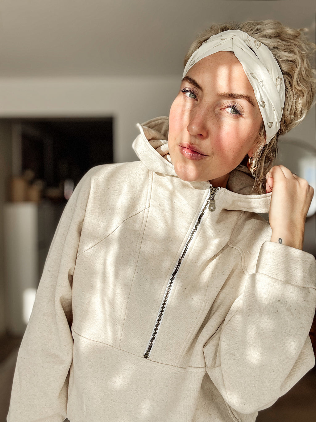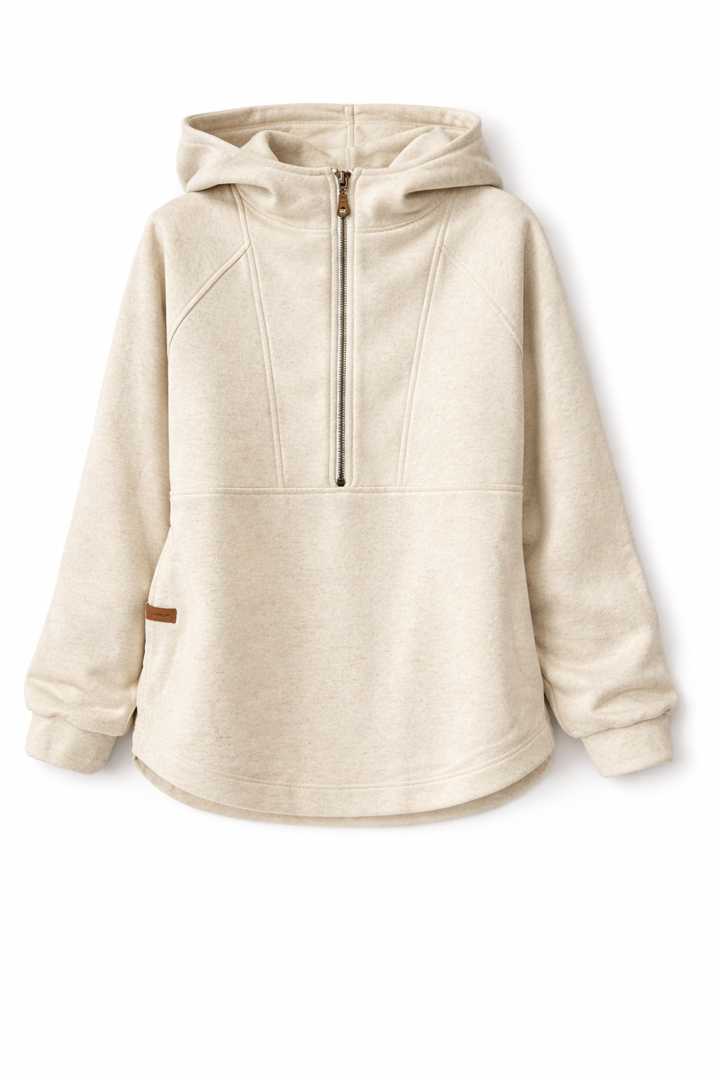 Das moderne Oversize-Design mit halbem Reißverschluss, großzügiger Kapuze und legerem Schnitt macht dieses Stück zu einem stilvollen Allrounder für entspannte Tage und besondere Momente.