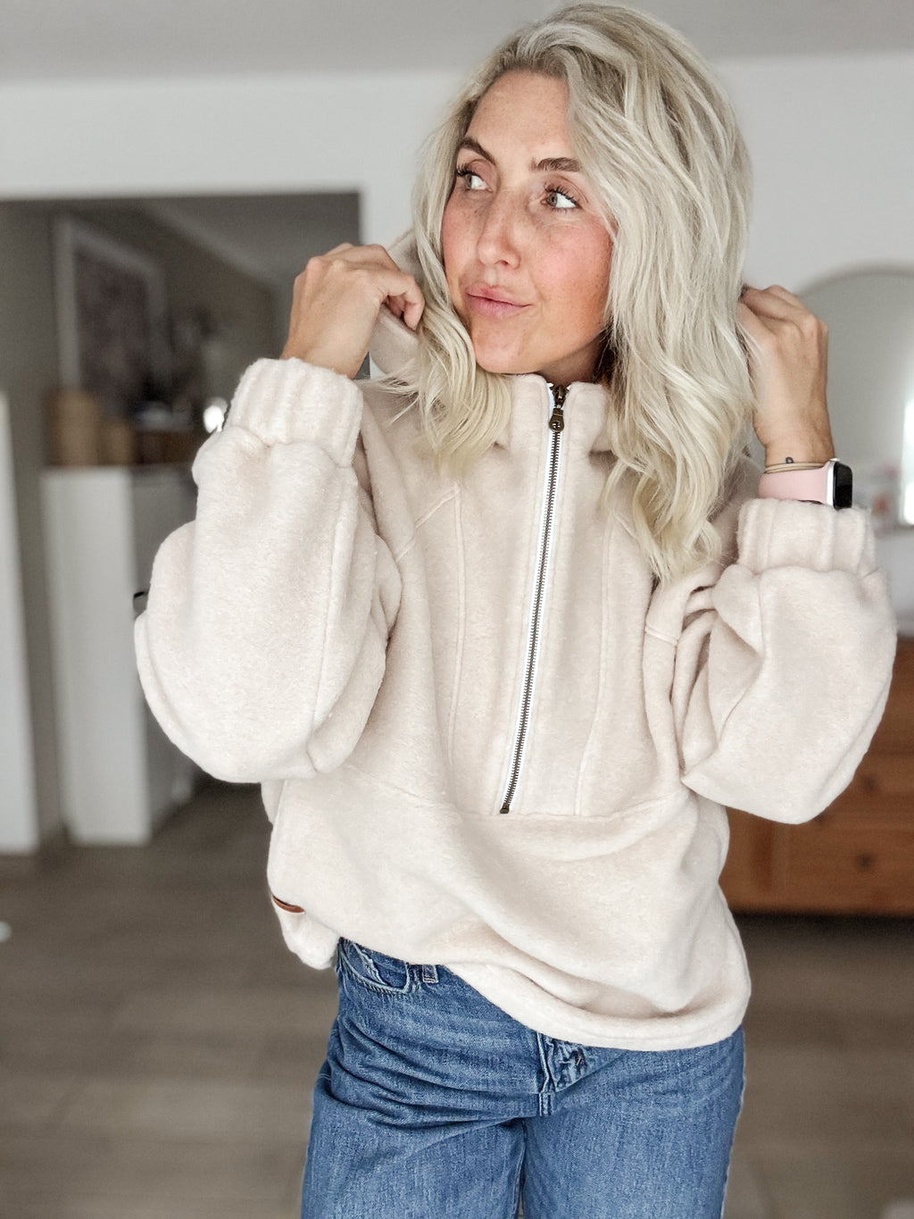 Das moderne Oversize-Design mit halbem Reißverschluss, großzügiger Kapuze und legerem Schnitt macht dieses Stück zu einem stilvollen Allrounder für entspannte Tage und besondere Momente. Die zarte Ecru-Nuance unterstreicht die feminine Eleganz und bringt zugleich einen frischen, modernen Look in Ihre Garderobe.